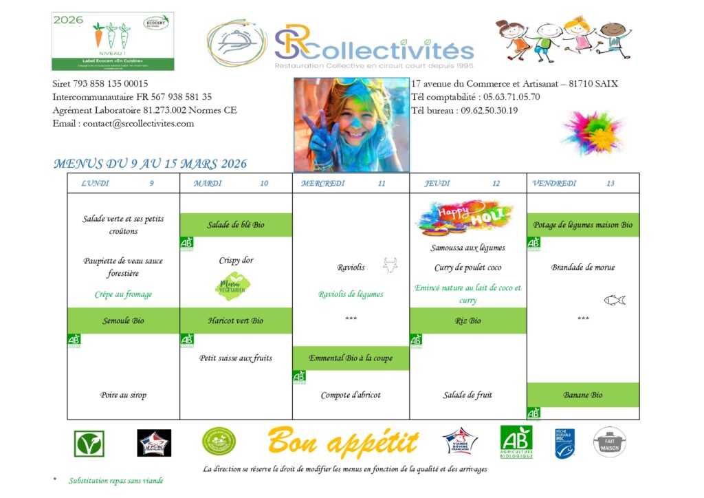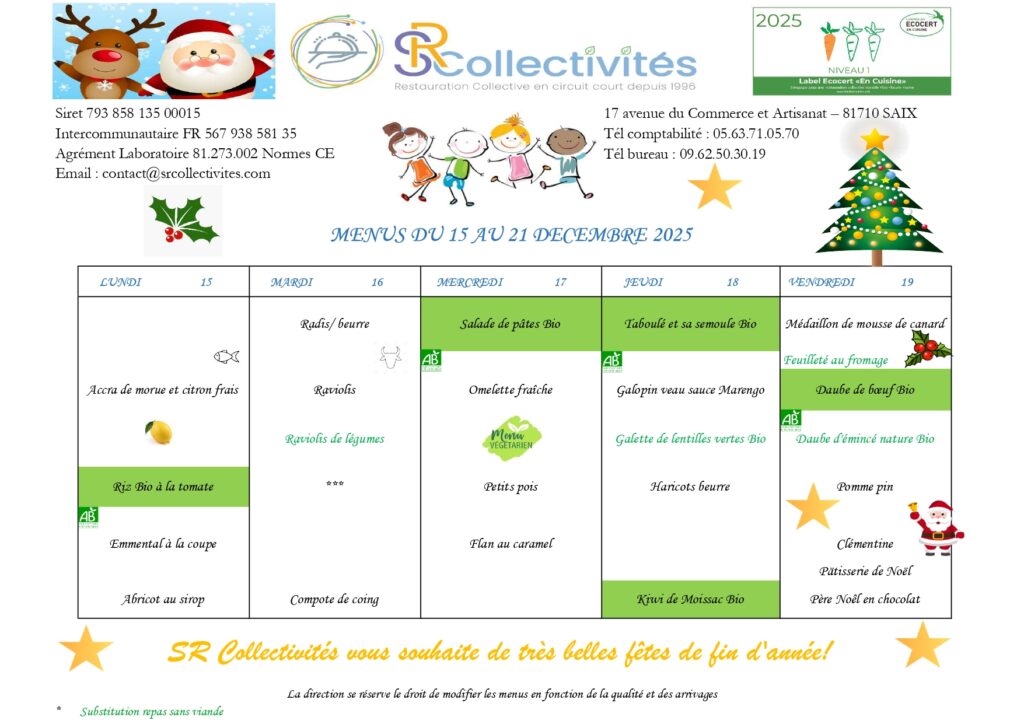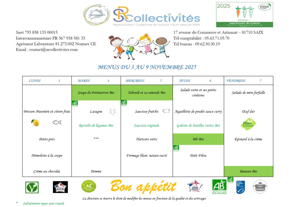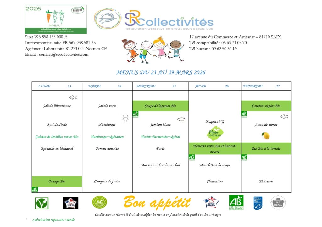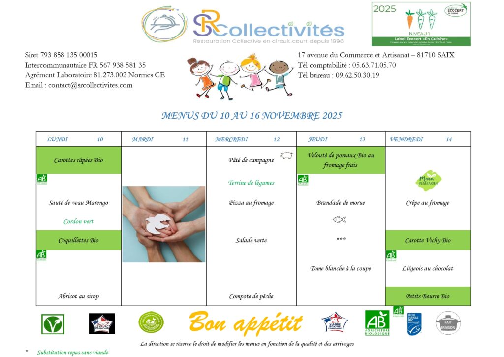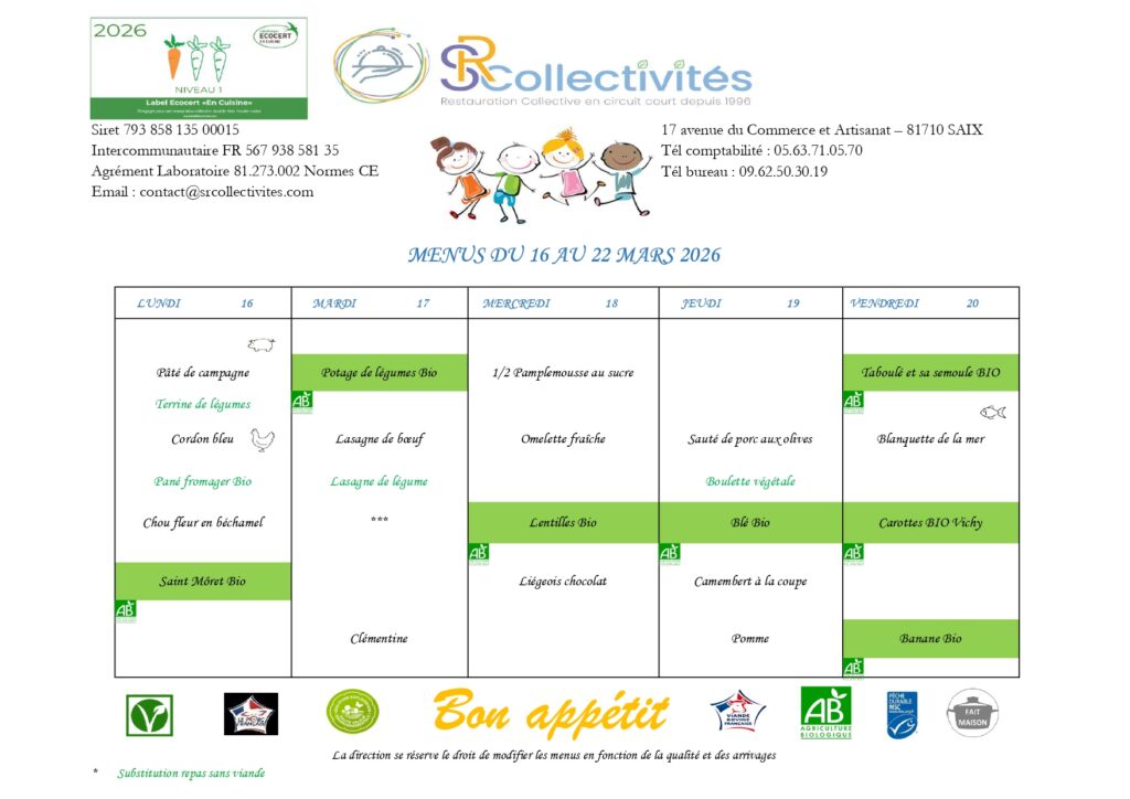 Les repas de la cantine d’Ambres sont préparés et livrés par SR Collectivités.