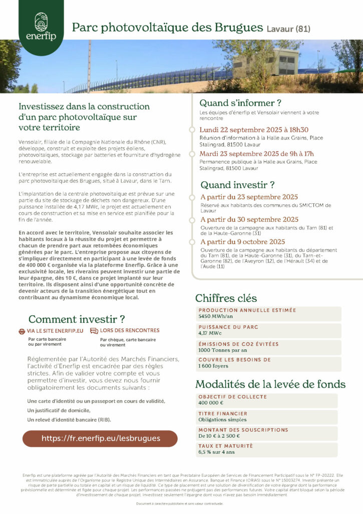 Dans le cadre du projet de centrale photovoltaïque sur le site des Brugues de Jonquière à Lavaur, Vensolair (le porteur du projet) associe les habitants du territoire par le biais d’une campagne de financement participatif qui débutera le mardi 23 septembre 2025 :